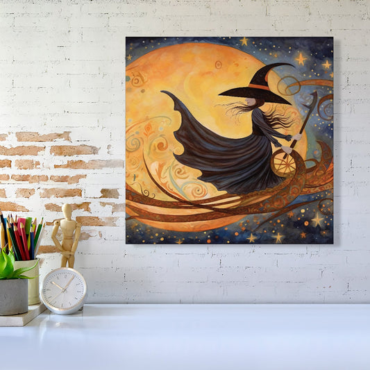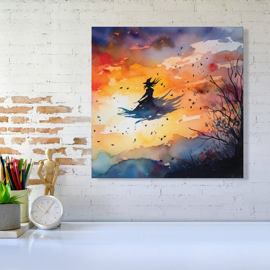 A Watercolor Featuring A Graceful Witch Framed Canvas
