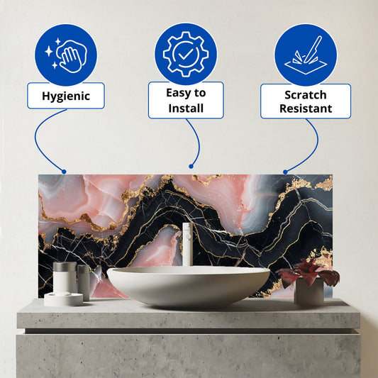 Baby Pink And Black Marble Effect Glass Bathroom Splashback