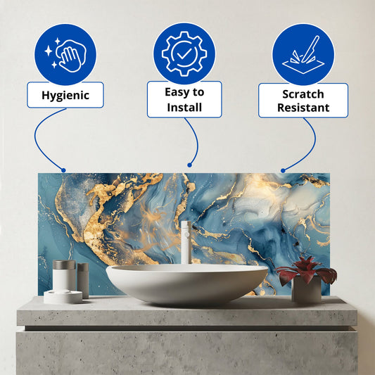 Azure And Gold Marble Effect Glass Bathroom Splashback