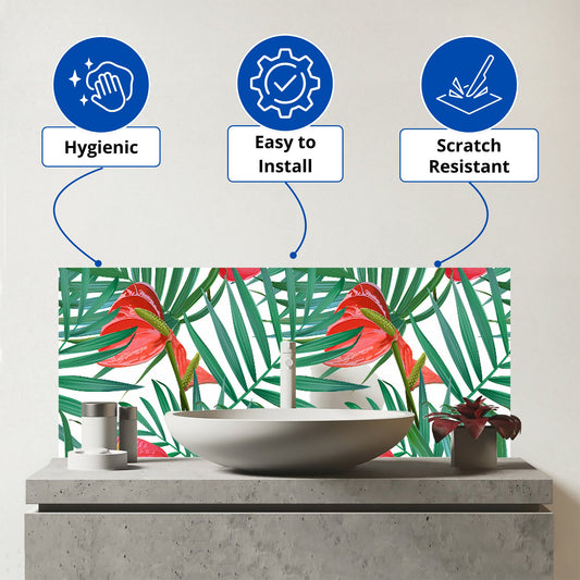 Tropical Flowers And Palm Leaves Glass Bathroom Splashback