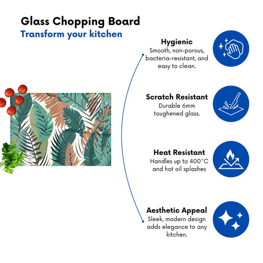 Tropical Floral Leaves Green Brown Glass Chopping Board