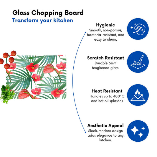 Tropical Flowers Palm Leaves Hawaiian Glass Chopping Board