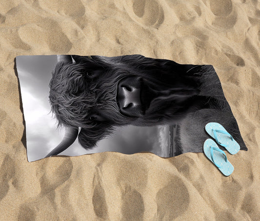 Black And White Highland Cow Beach Towel