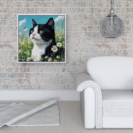 Black And White Cat In A Summer Meadow Framed Canvas