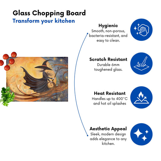Whimsical Witch On A Broomstick Glass Chopping Board