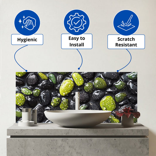 Emerald and Onyx Pebble Design Glass Bathroom Splashback