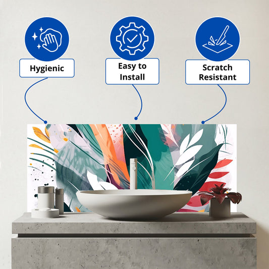 Coloured Abstrace Feather Leaves Glass Bathroom Splashback