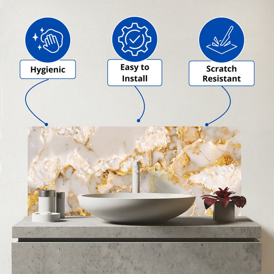 Gold And White Quartz Effect Glass Bathroom Splashback