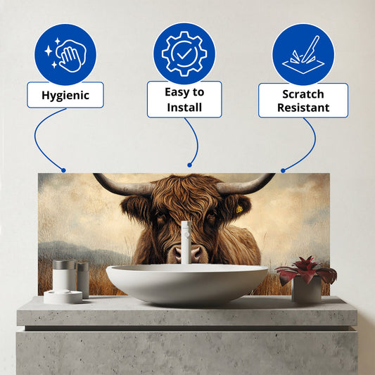 Bronze Effect Highland Cow Glass Bathroom Splashback