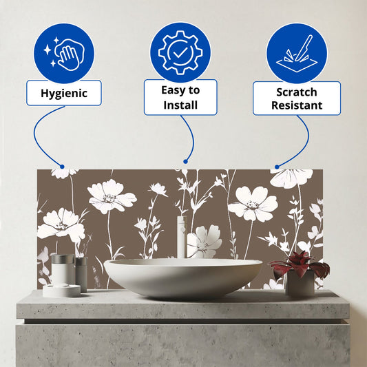 Taupe And White Floral Silhouette Glass Bathroom Splashback