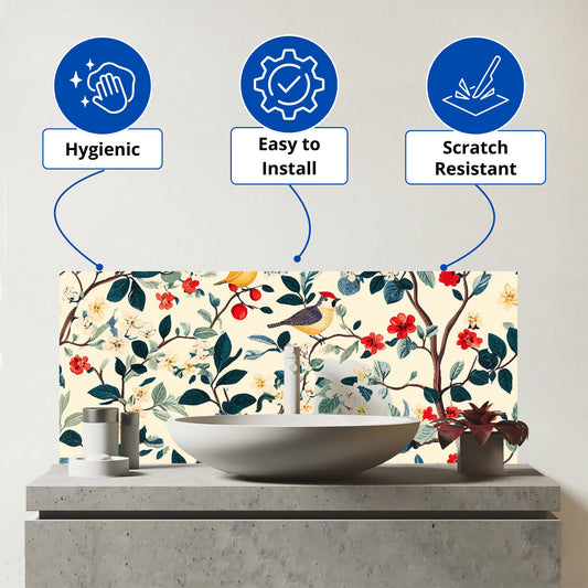 Woodland Birds And Flowers In The Trees Glass Bathroom Splashback