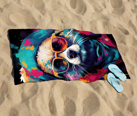 Multi Coloured Splashart Dog With Glasses Beach Towel