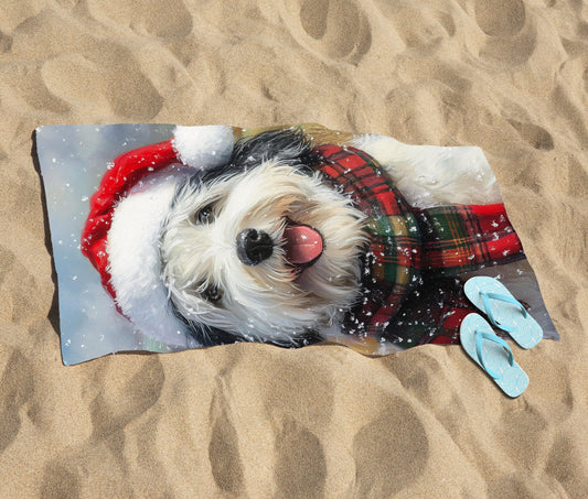 Christmas Old English Sheepdog Beach Towel