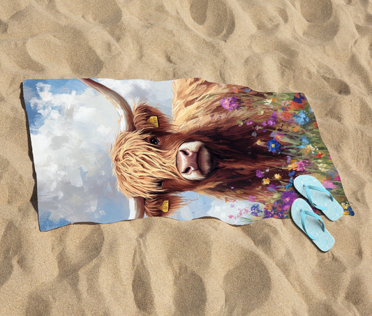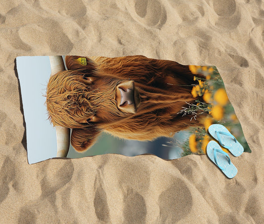 Highland Cow And Summer Flowers Beach Towel