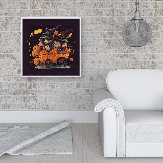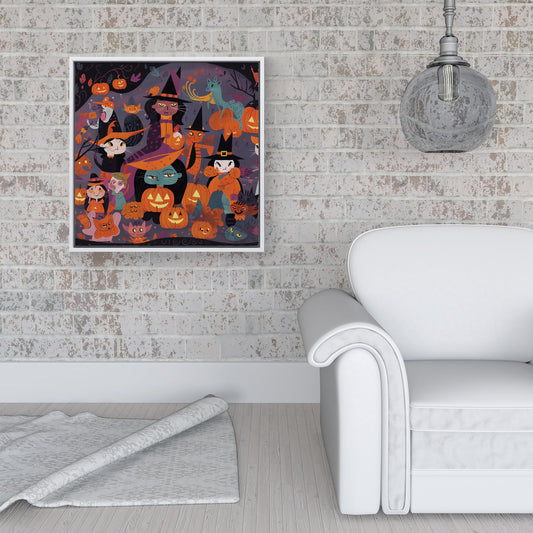 A Vibrant Illustration Of Witches And Pumpkin Framed Canvas