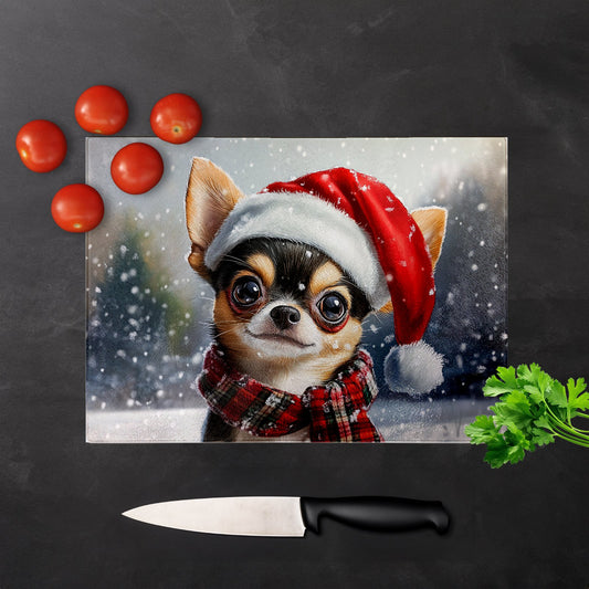 Snowy Christmas Chihuahua Glass Chopping Board