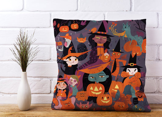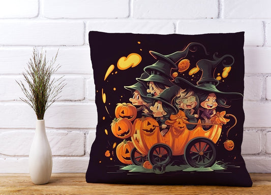 A Vibrant Illustration Of Witches And Pumpkin Cushions