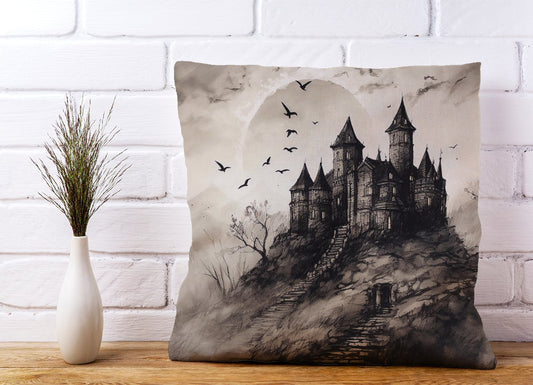 A Realistic Ink Drawing Of A Haunted Castle Cushions