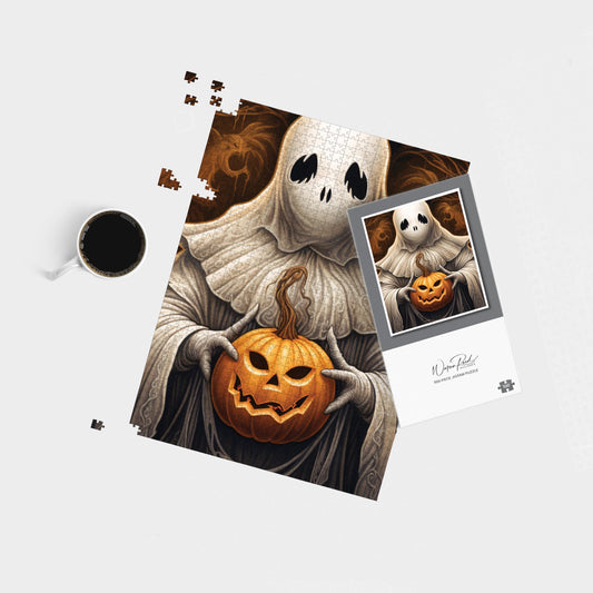 Spooky White Ghost Holding Pumpkin Jigsaw Puzzle
