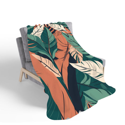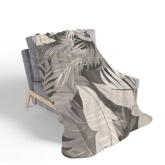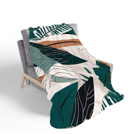 Tropical Floral Leaves Green Brown Sherpa Blanket