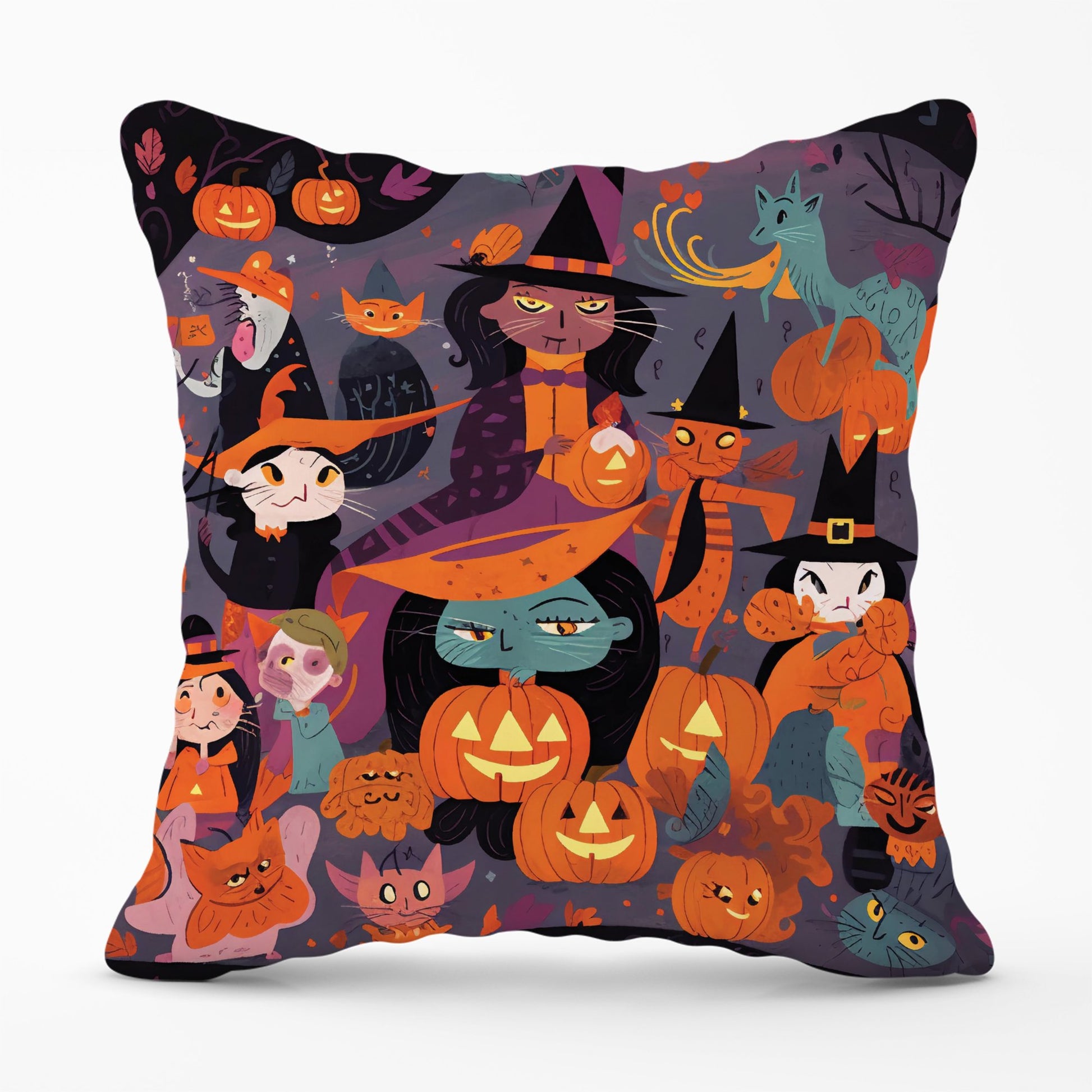A Vibrant Illustration Of Witches And Pumpkin Cushions