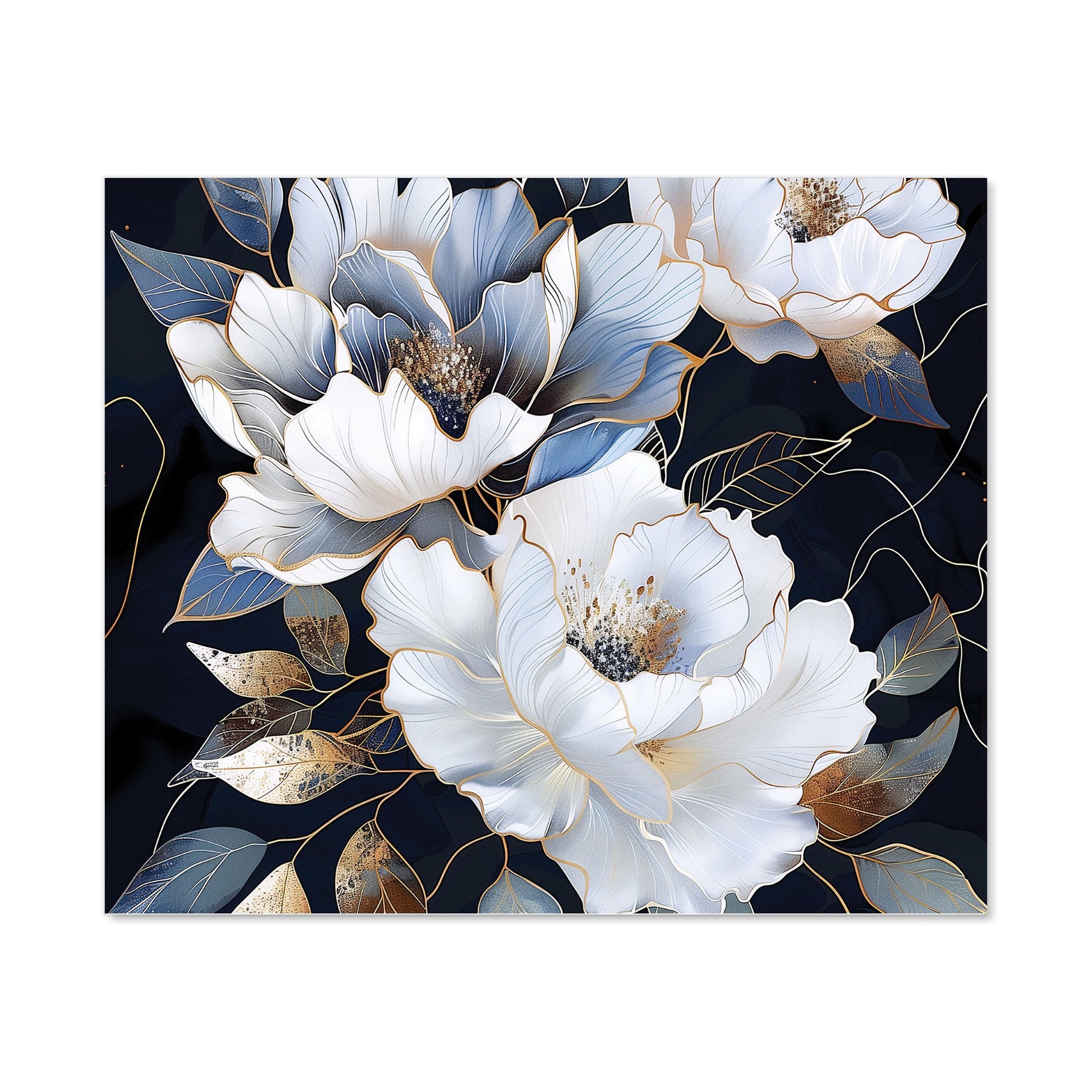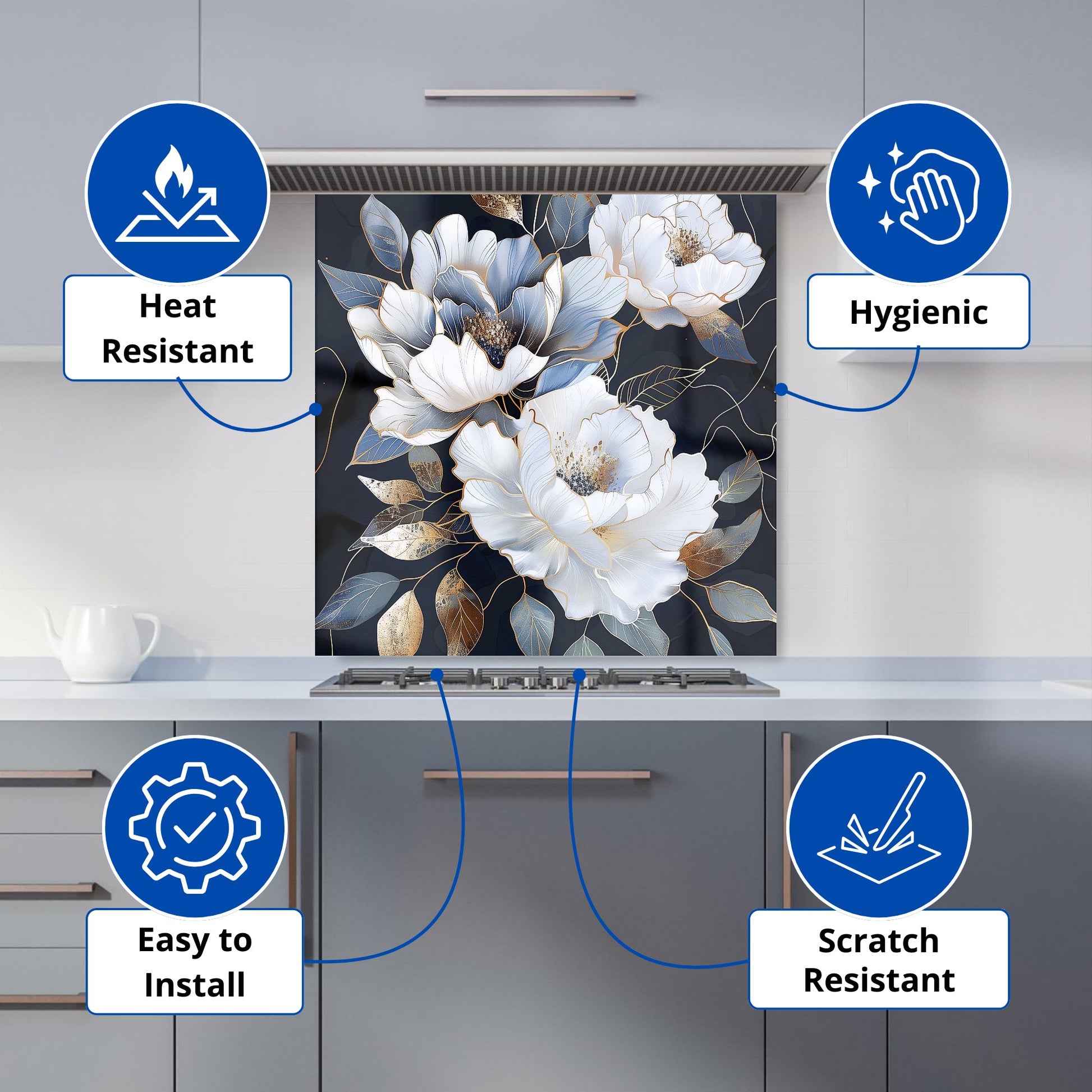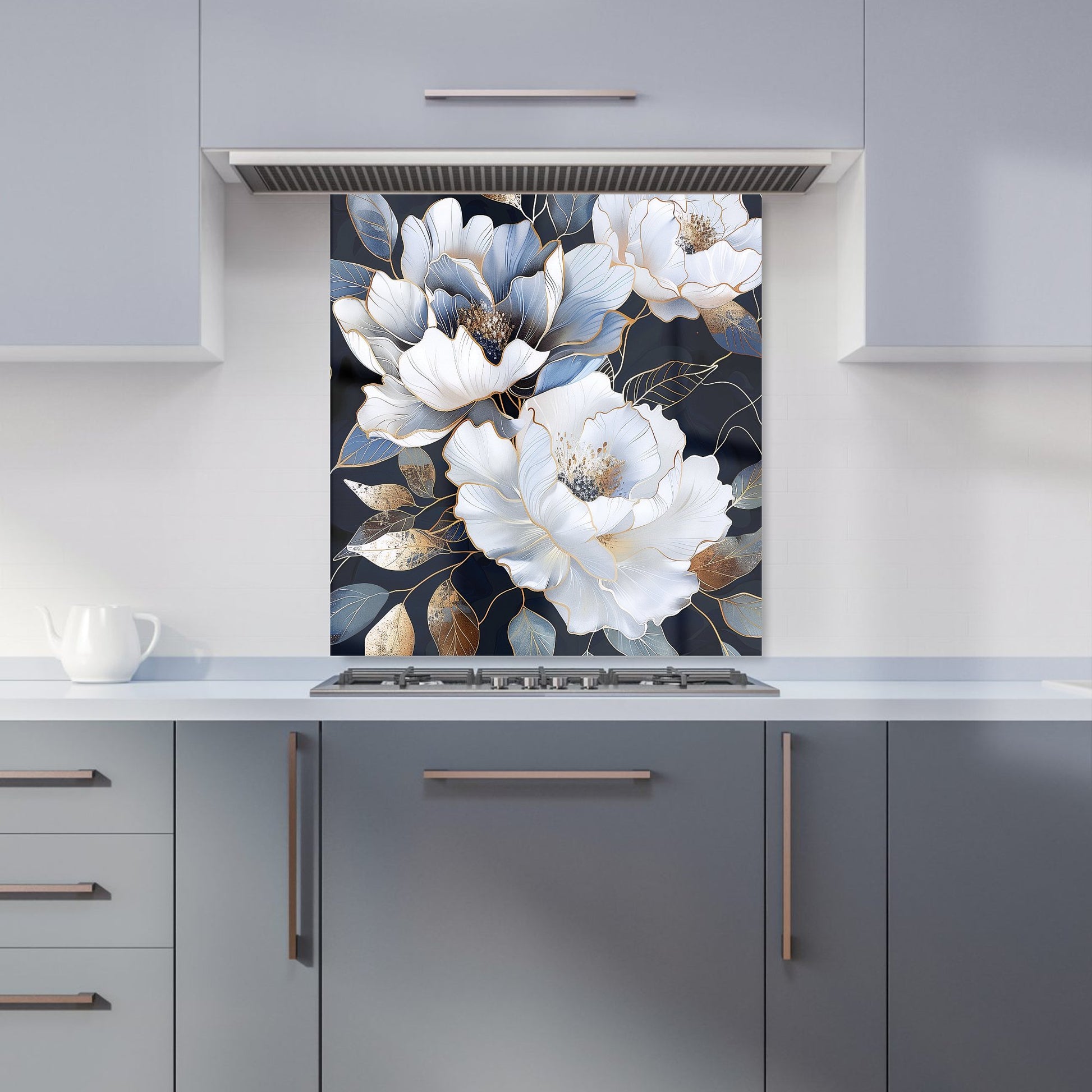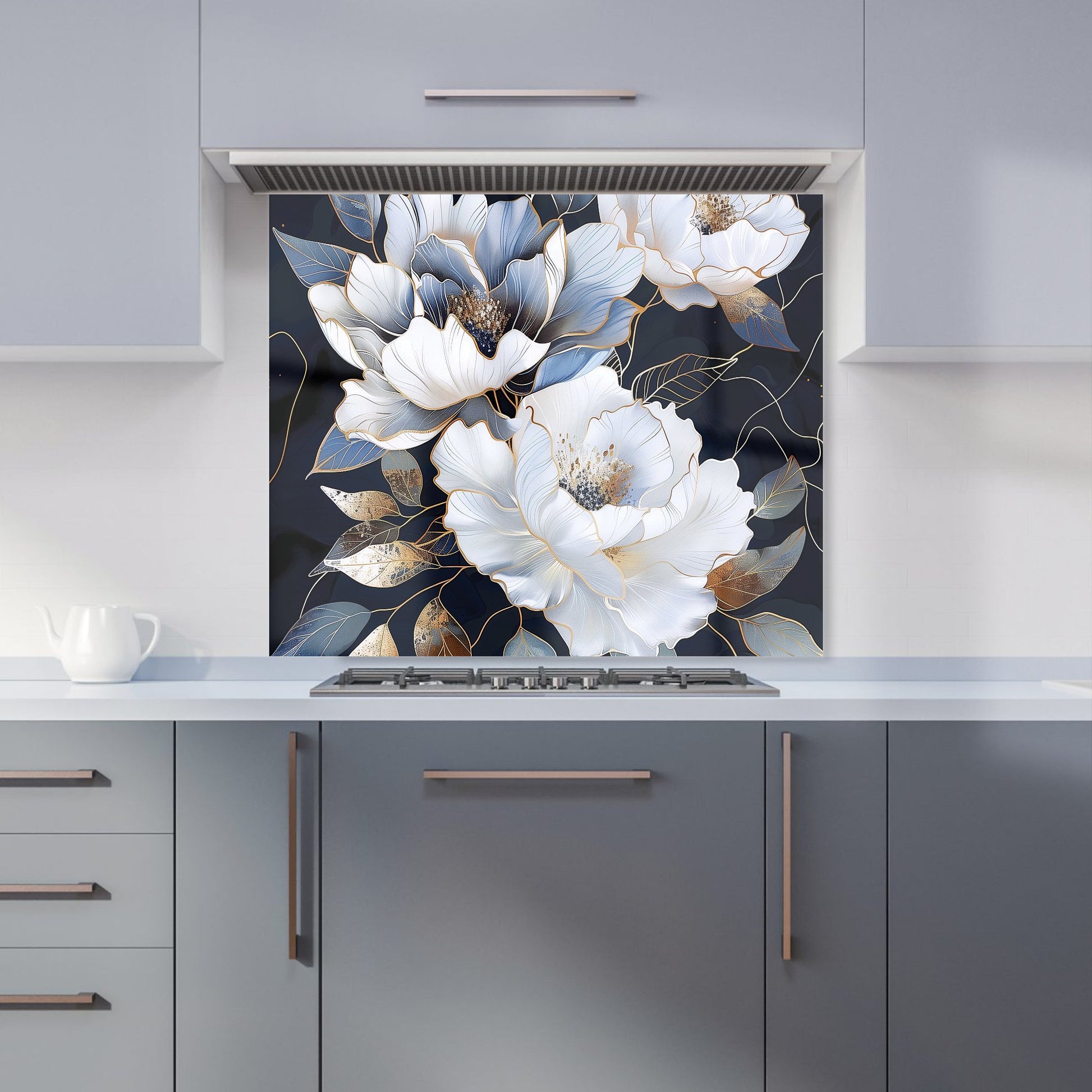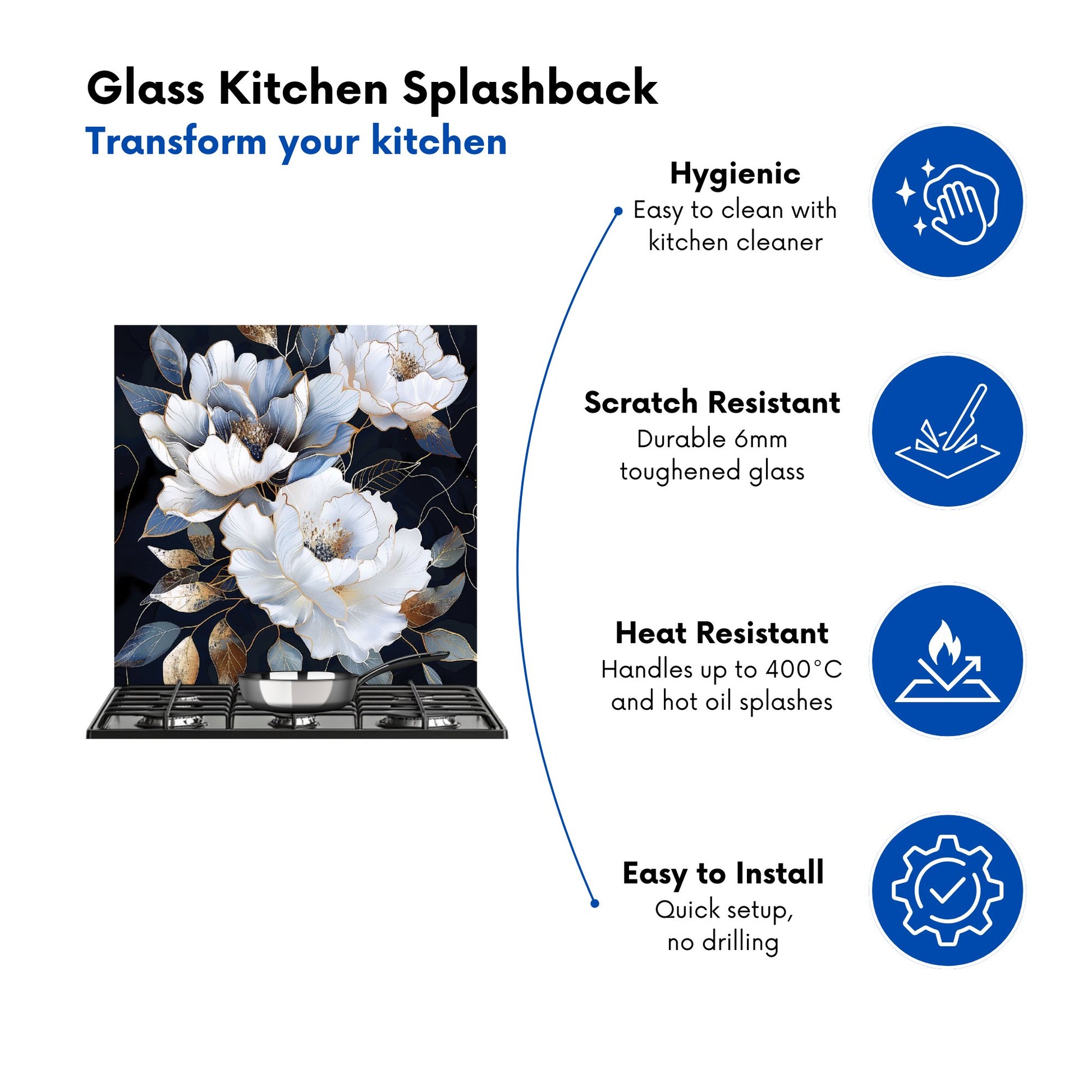Elegant Floral Symphony in Blue and Gold Kitchen Splashback