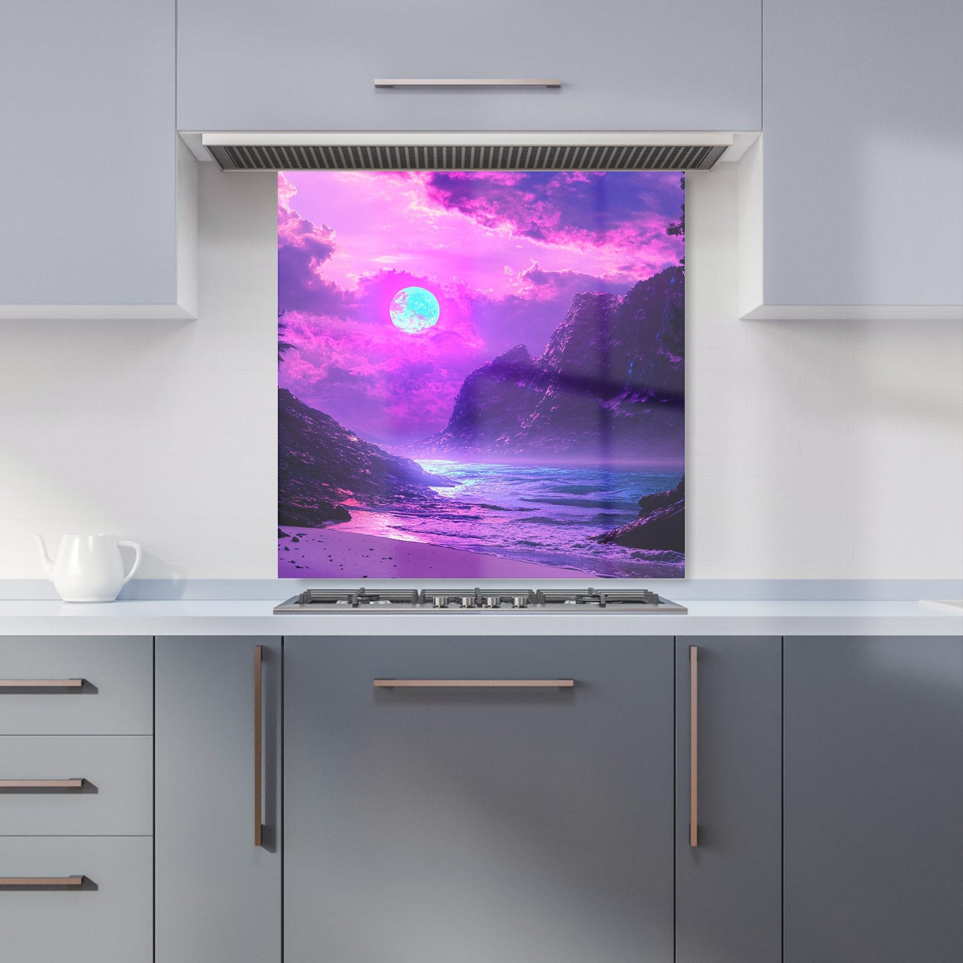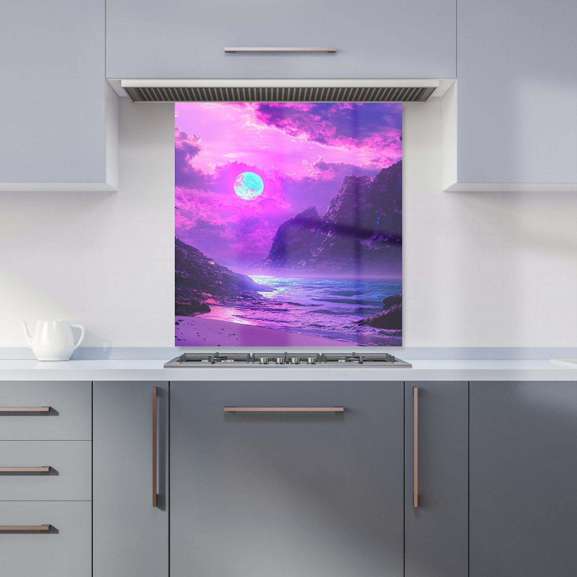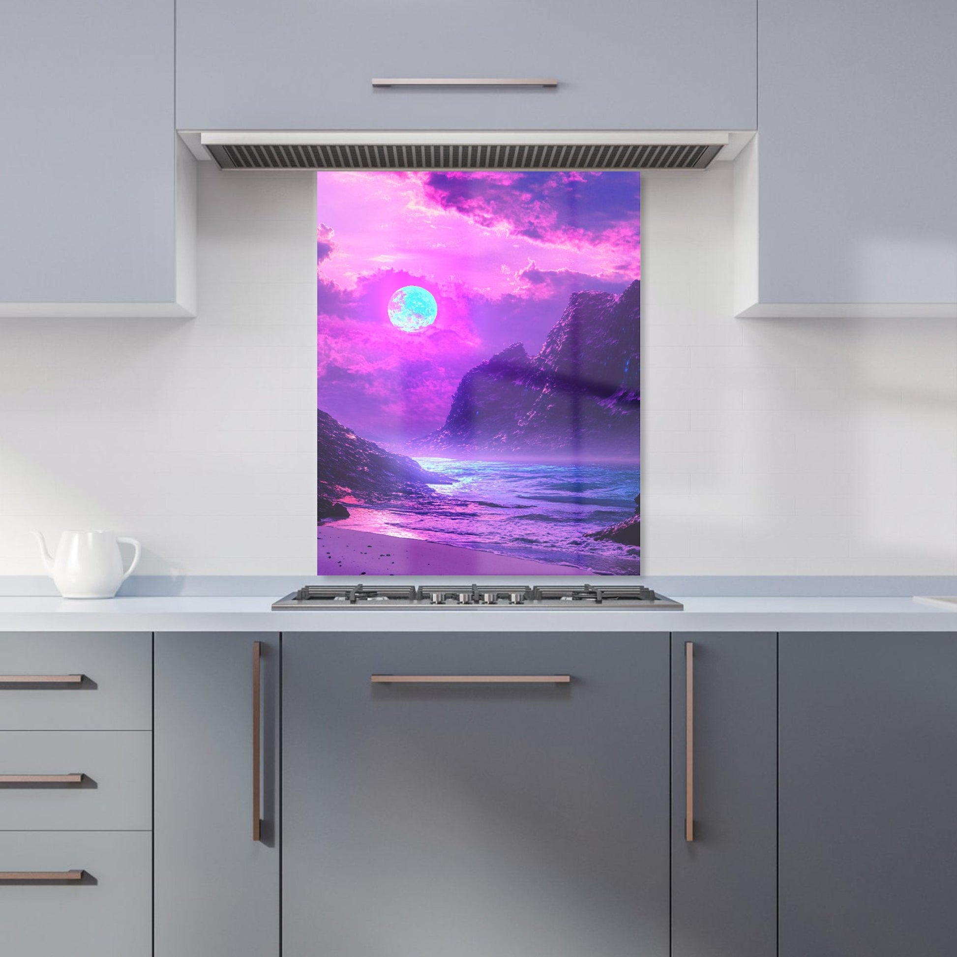 Enhance your kitchen with the captivating design of an Elena Sable glass splashback. Each piece features Elena's digital surrealist art, showcasing vivid, dreamlike imagery and otherworldly scenes that blend reality with the subconscious. Her hyper-realistic yet fantastical landscapes are brought to life in vibrant purples, blues, and neon pinks.