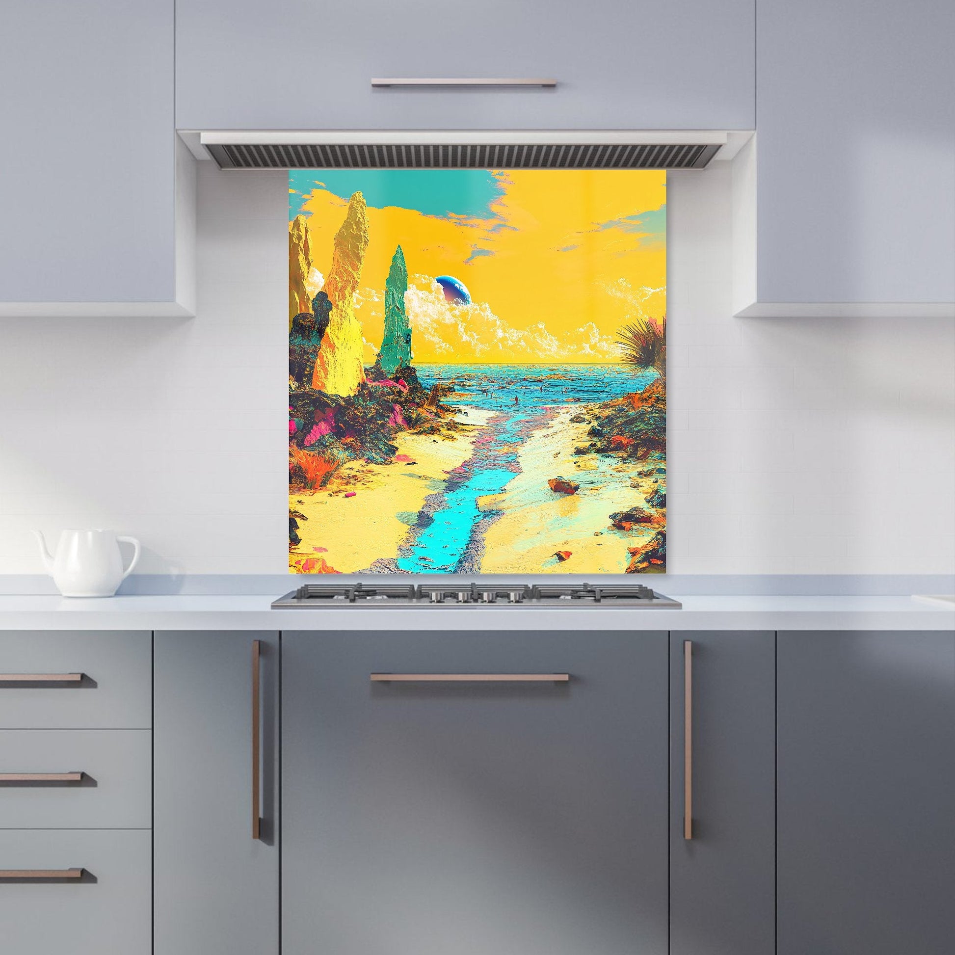 Enhance your kitchen with the captivating design of an Elena Sable glass splashback. Each piece features Elena's digital surrealist art, showcasing vivid, dreamlike imagery and otherworldly scenes that blend reality with the subconscious. Her hyper-realistic yet fantastical landscapes are brought to life in vibrant purples, blues, and neon pinks.