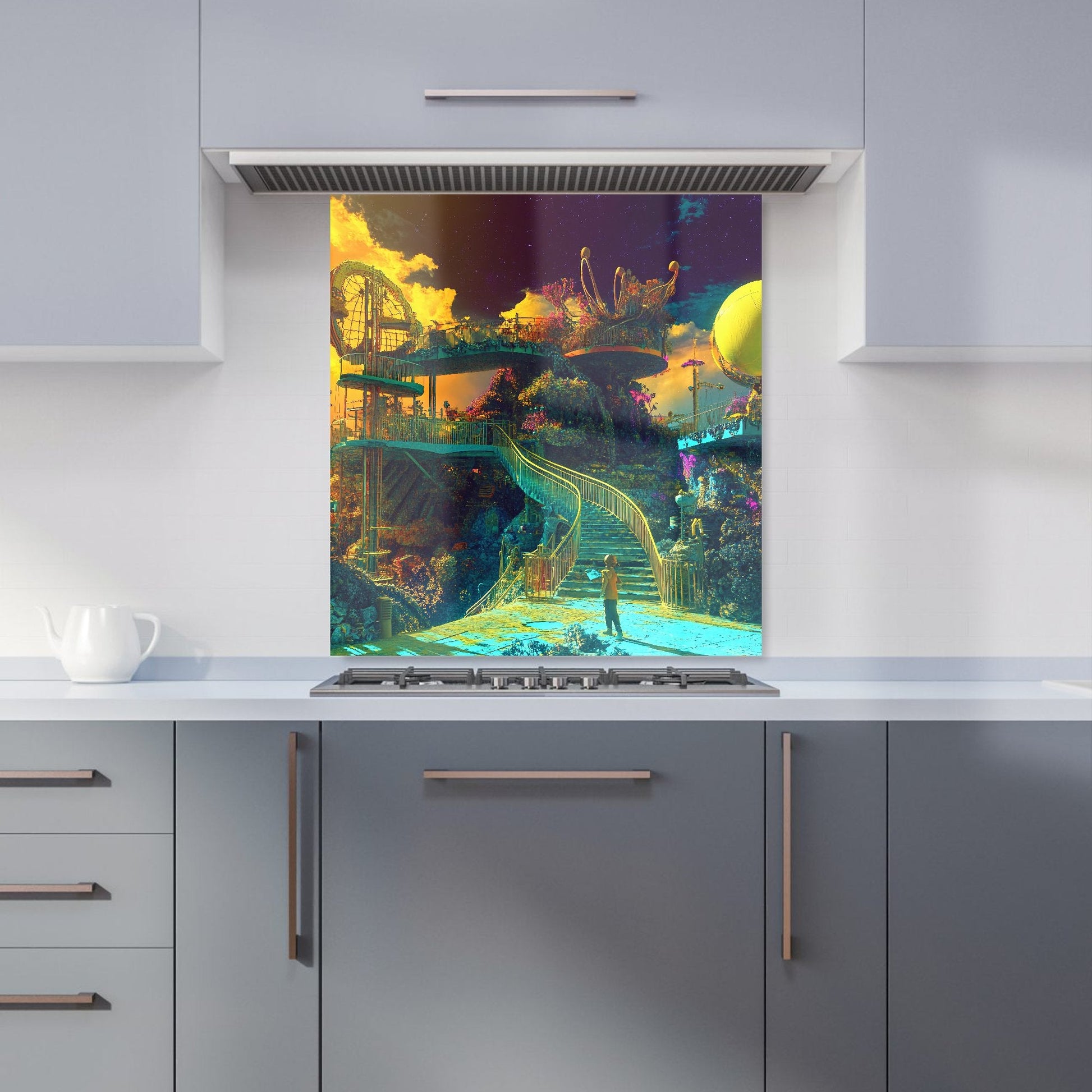 Enhance your kitchen with the captivating design of an Elena Sable glass splashback. Each piece features Elena's digital surrealist art, showcasing vivid, dreamlike imagery and otherworldly scenes that blend reality with the subconscious. Her hyper-realistic yet fantastical landscapes are brought to life in vibrant purples, blues, and neon pinks.