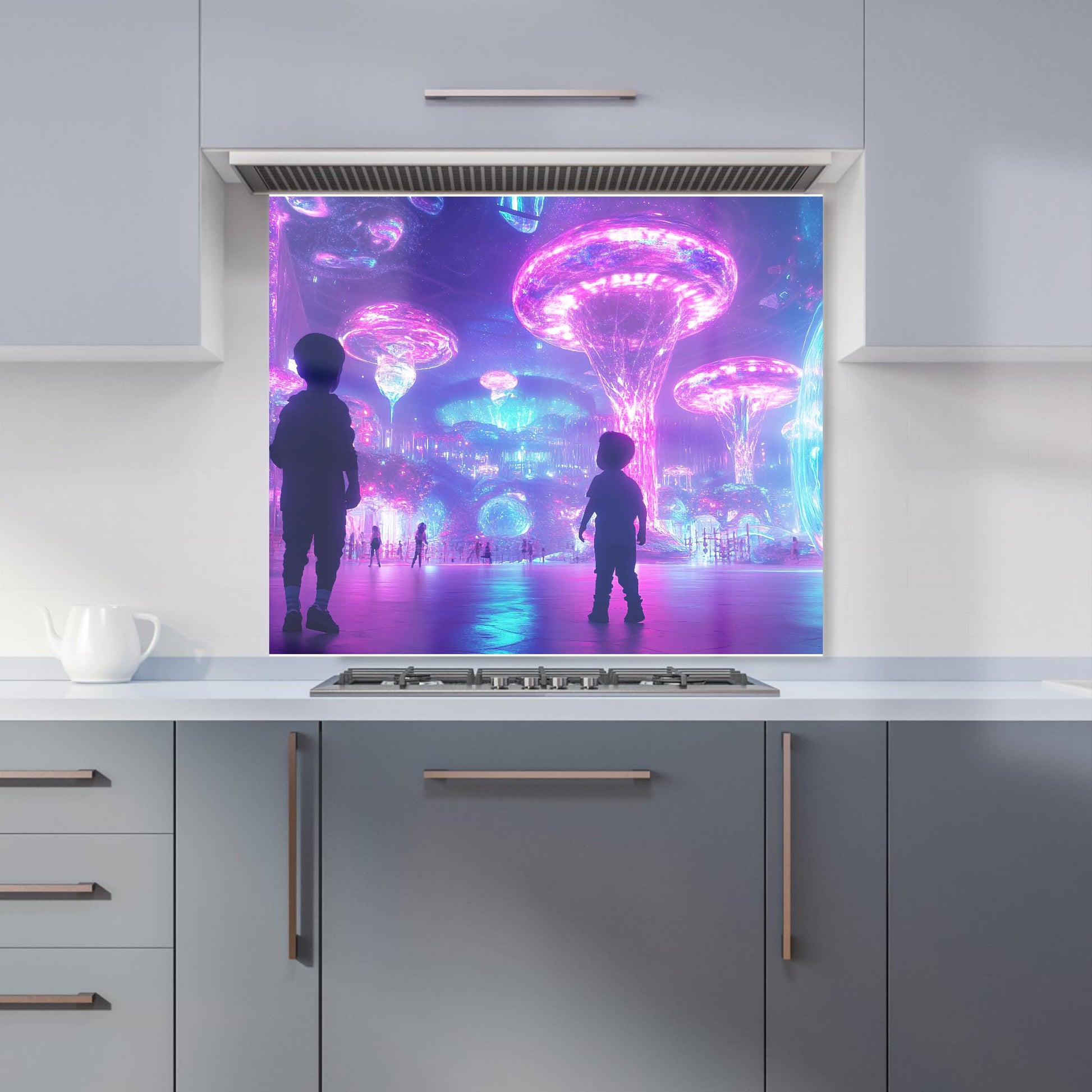 Enhance your kitchen with the captivating design of an Elena Sable glass splashback. Each piece features Elena's digital surrealist art, showcasing vivid, dreamlike imagery and otherworldly scenes that blend reality with the subconscious. Her hyper-realistic yet fantastical landscapes are brought to life in vibrant purples, blues, and neon pinks.