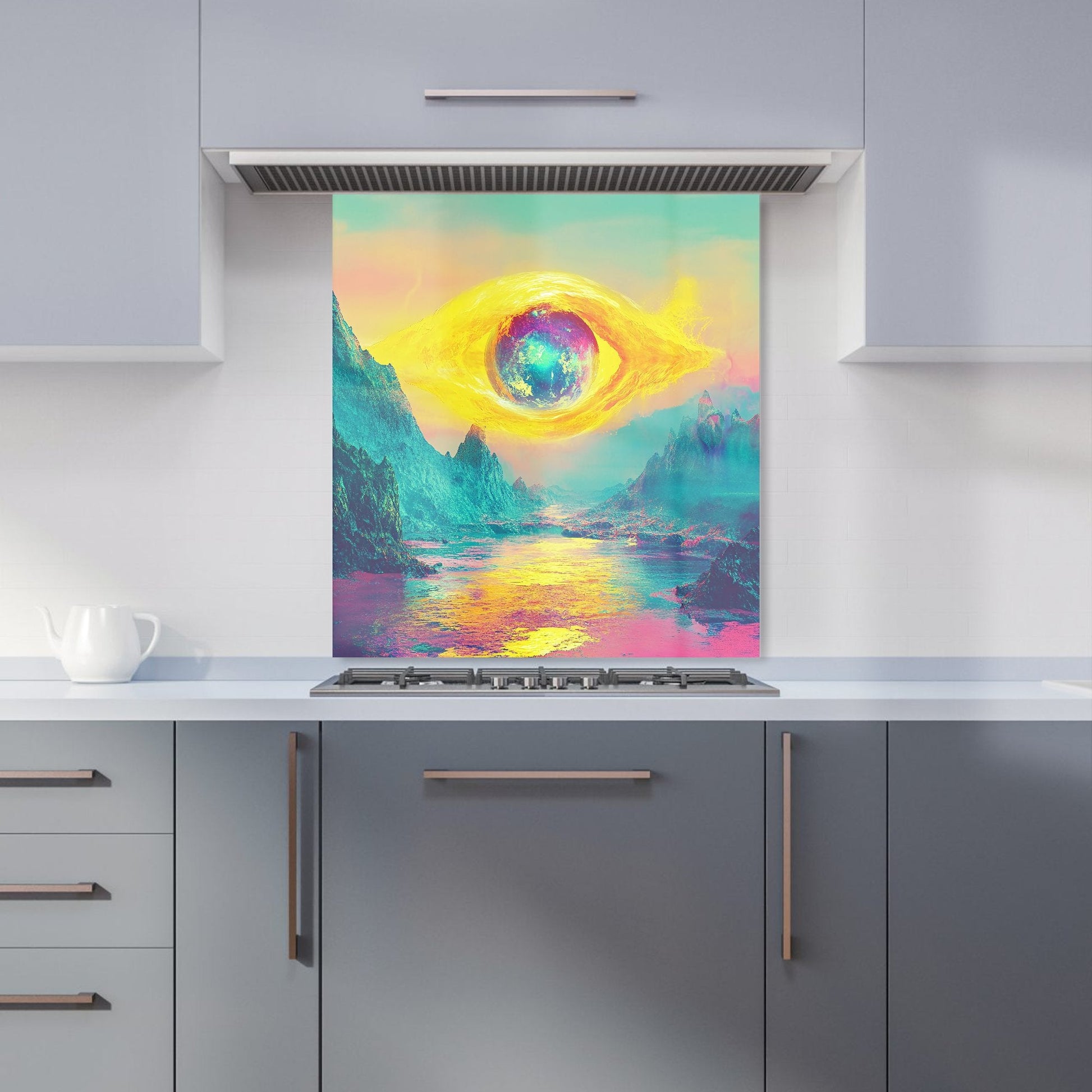 Enhance your kitchen with the captivating design of an Elena Sable glass splashback. Each piece features Elena's digital surrealist art, showcasing vivid, dreamlike imagery and otherworldly scenes that blend reality with the subconscious. Her hyper-realistic yet fantastical landscapes are brought to life in vibrant purples, blues, and neon pinks.