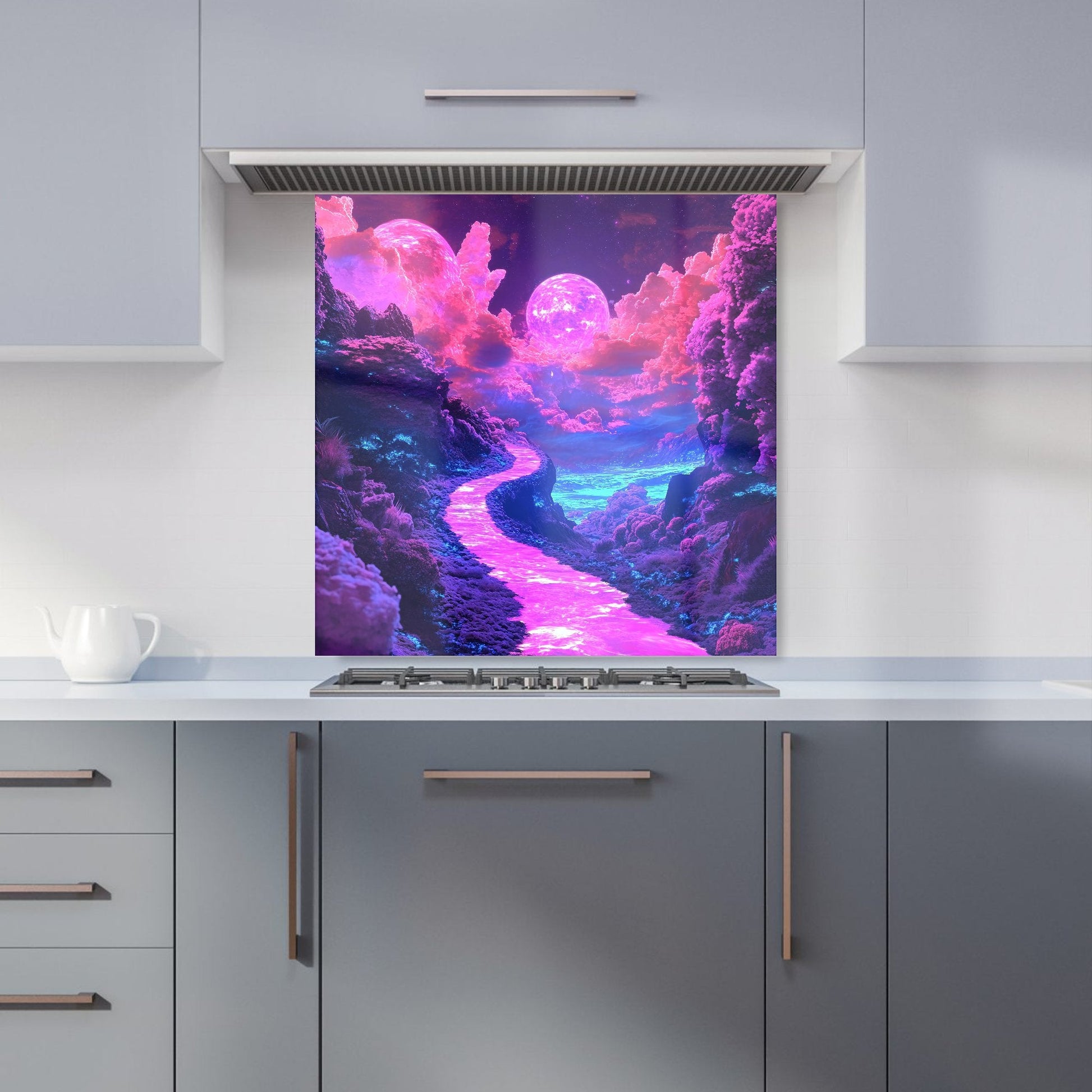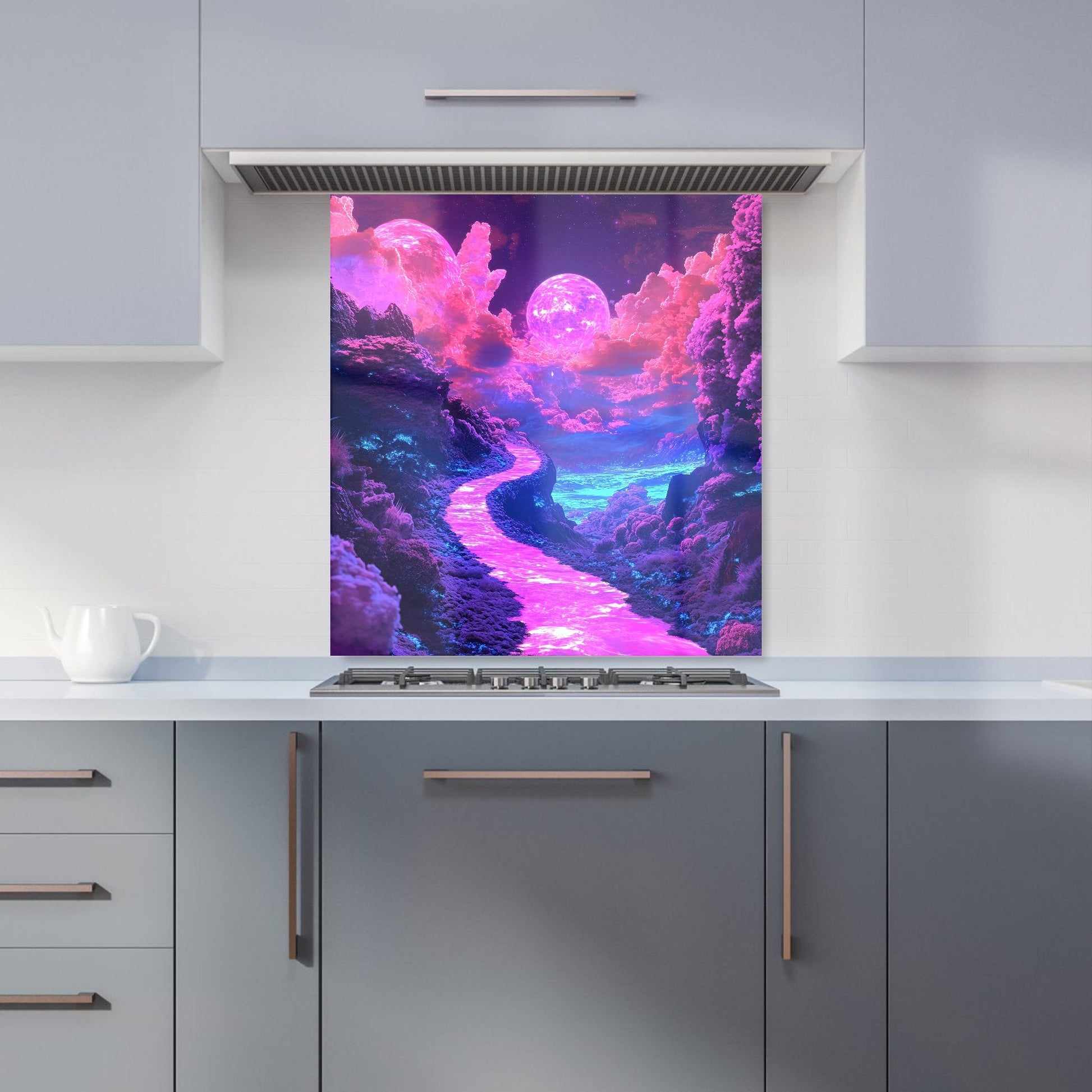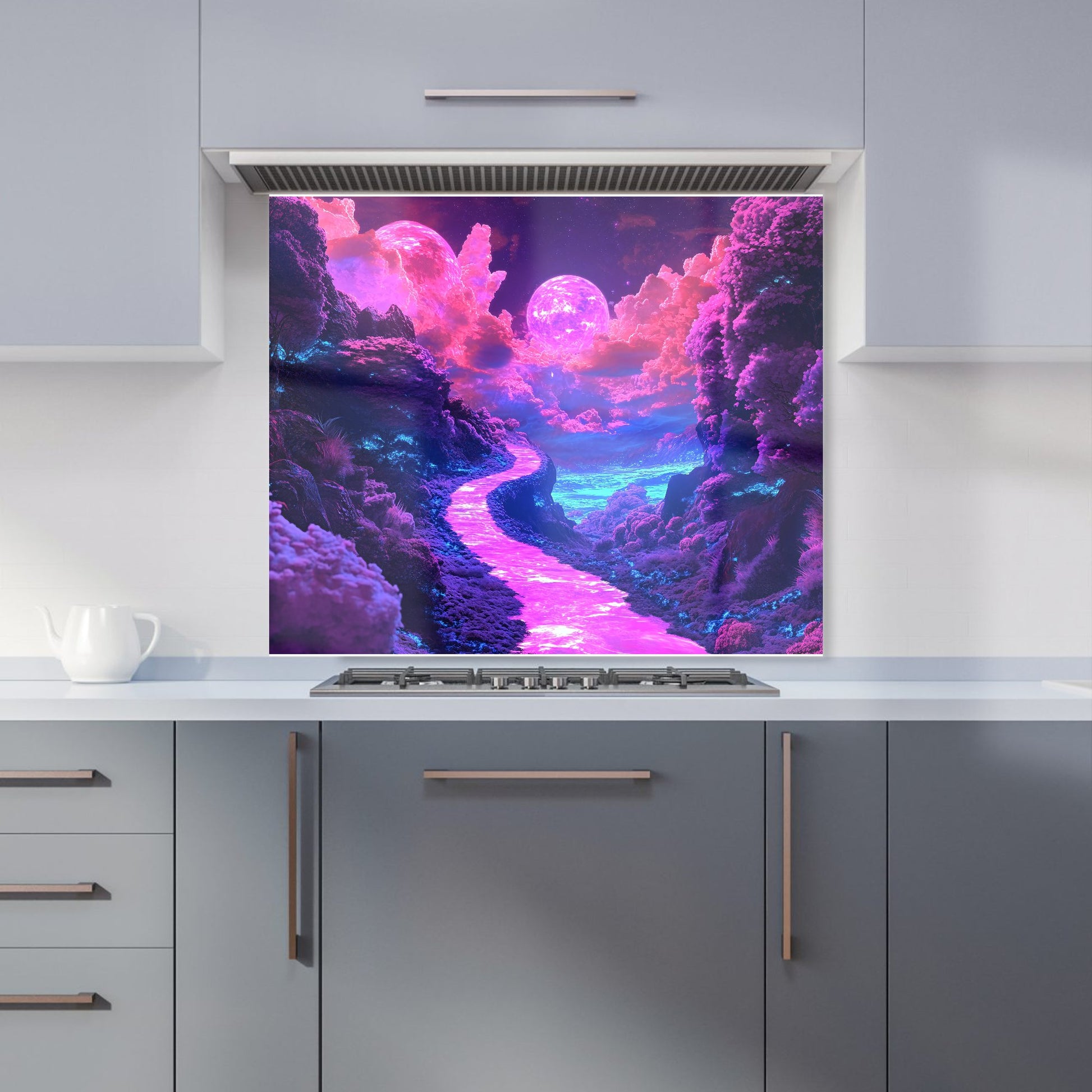 Enhance your kitchen with the captivating design of an Elena Sable glass splashback. Each piece features Elena's digital surrealist art, showcasing vivid, dreamlike imagery and otherworldly scenes that blend reality with the subconscious. Her hyper-realistic yet fantastical landscapes are brought to life in vibrant purples, blues, and neon pinks.