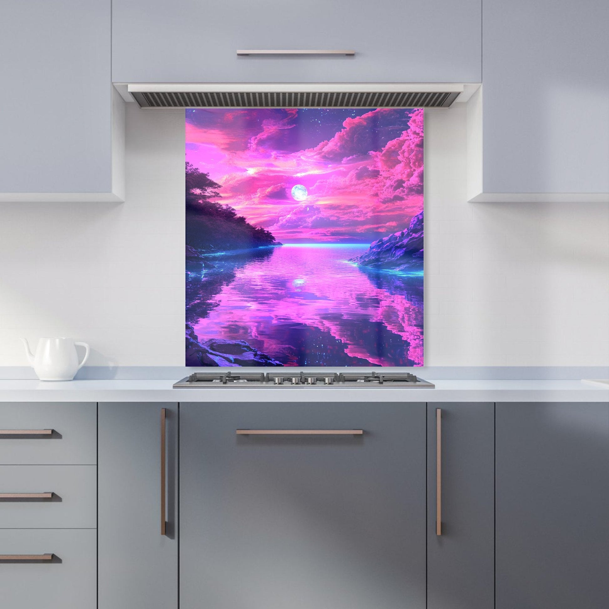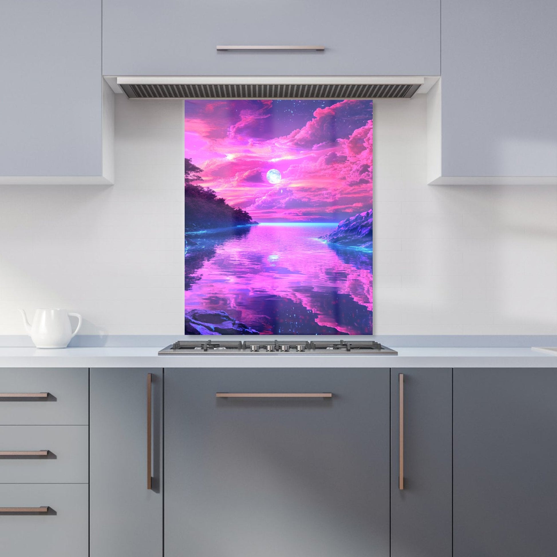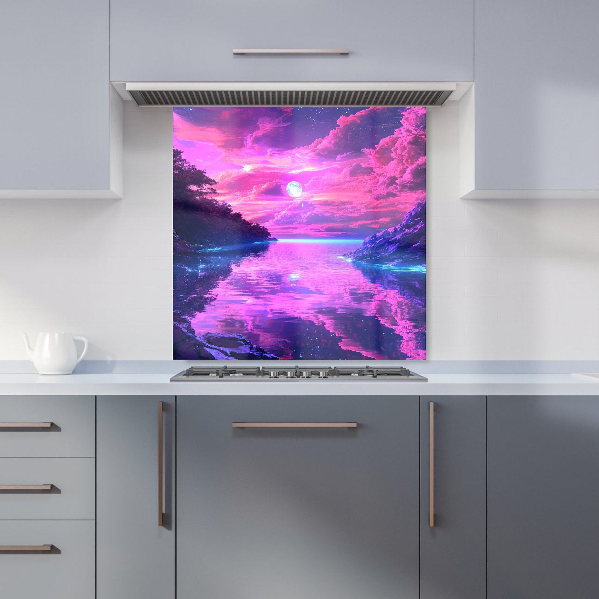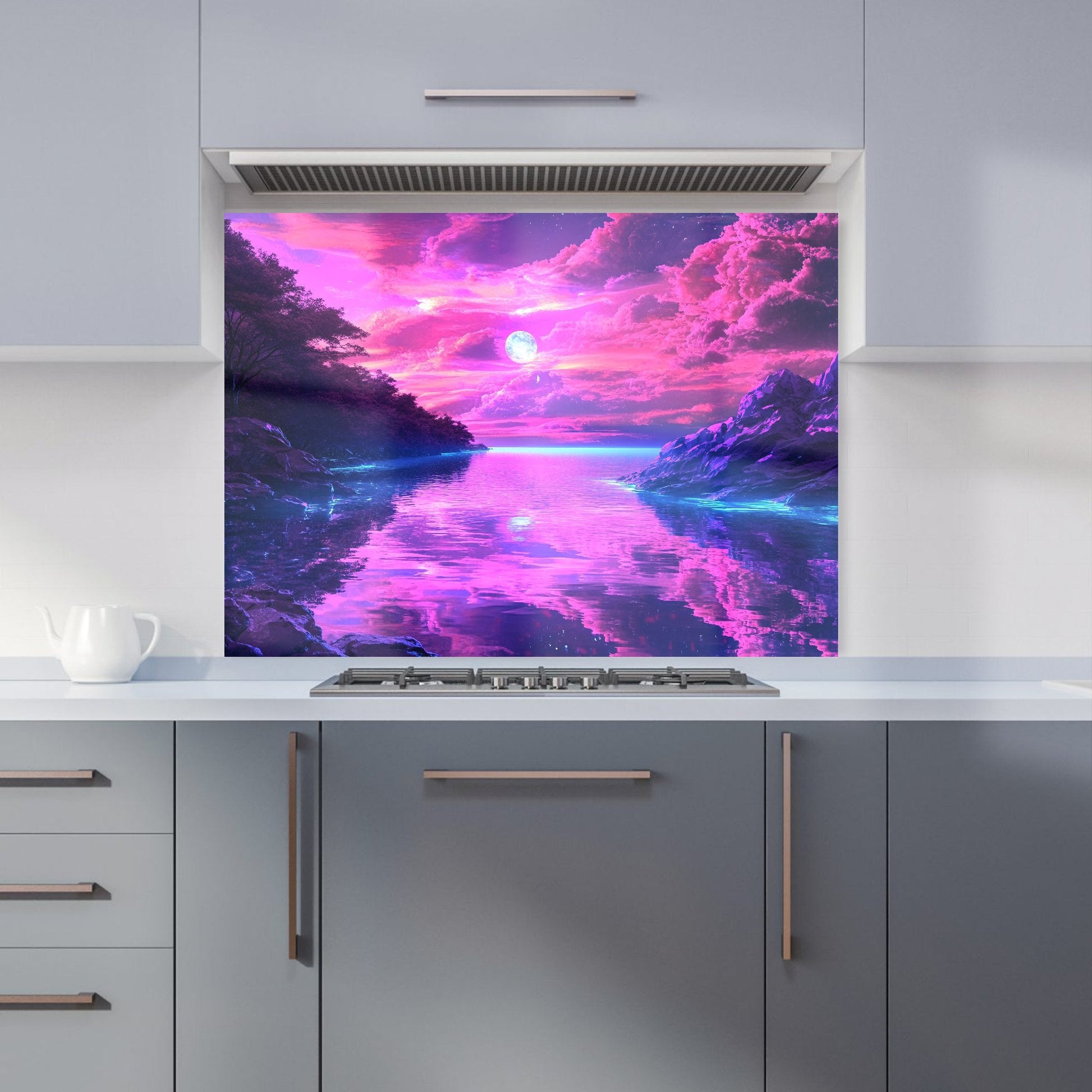 Enhance your kitchen with the captivating design of an Elena Sable glass splashback. Each piece features Elena's digital surrealist art, showcasing vivid, dreamlike imagery and otherworldly scenes that blend reality with the subconscious. Her hyper-realistic yet fantastical landscapes are brought to life in vibrant purples, blues, and neon pinks.