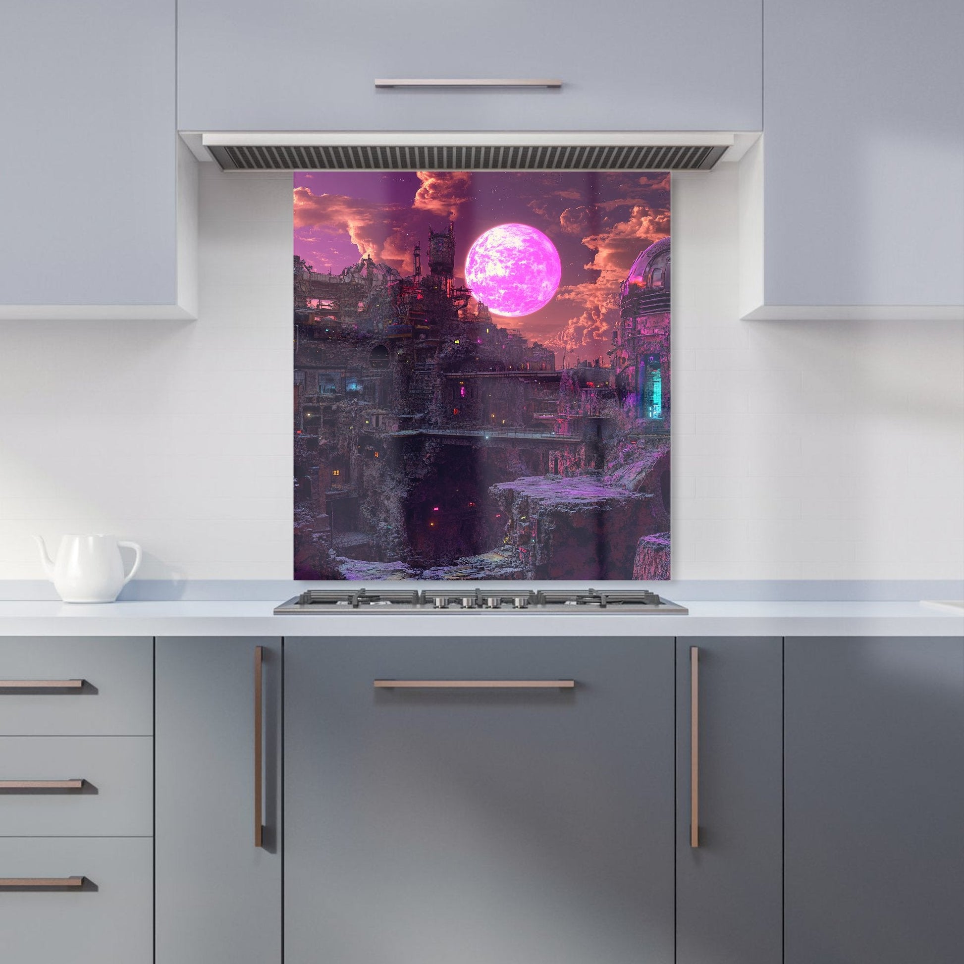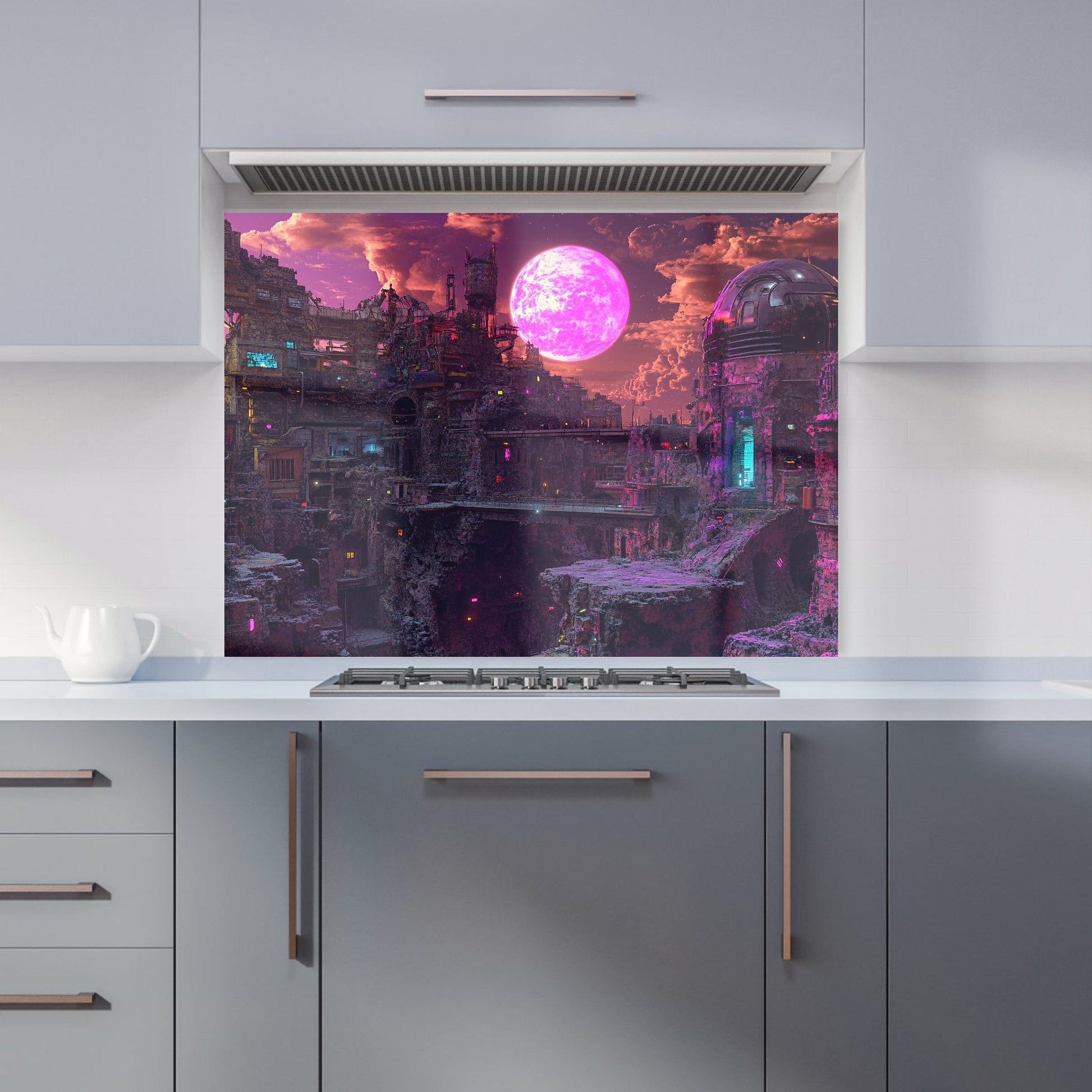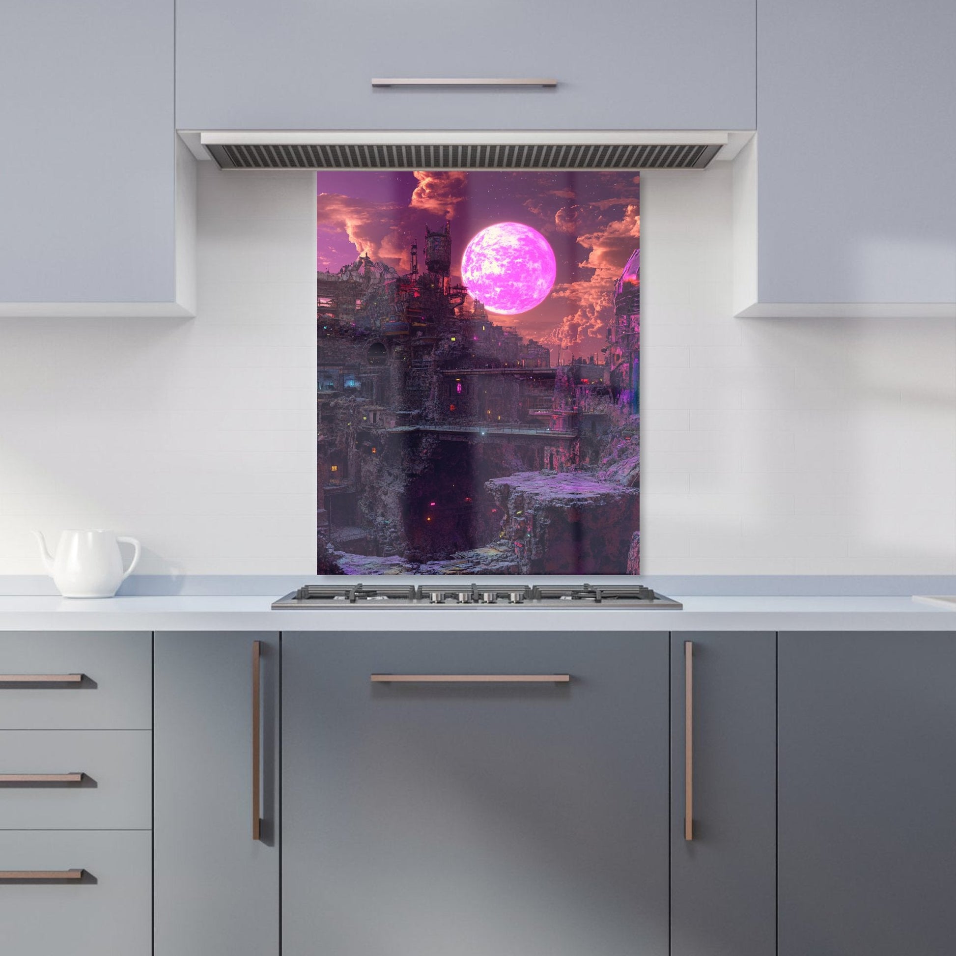 Enhance your kitchen with the captivating design of an Elena Sable glass splashback. Each piece features Elena's digital surrealist art, showcasing vivid, dreamlike imagery and otherworldly scenes that blend reality with the subconscious. Her hyper-realistic yet fantastical landscapes are brought to life in vibrant purples, blues, and neon pinks.
