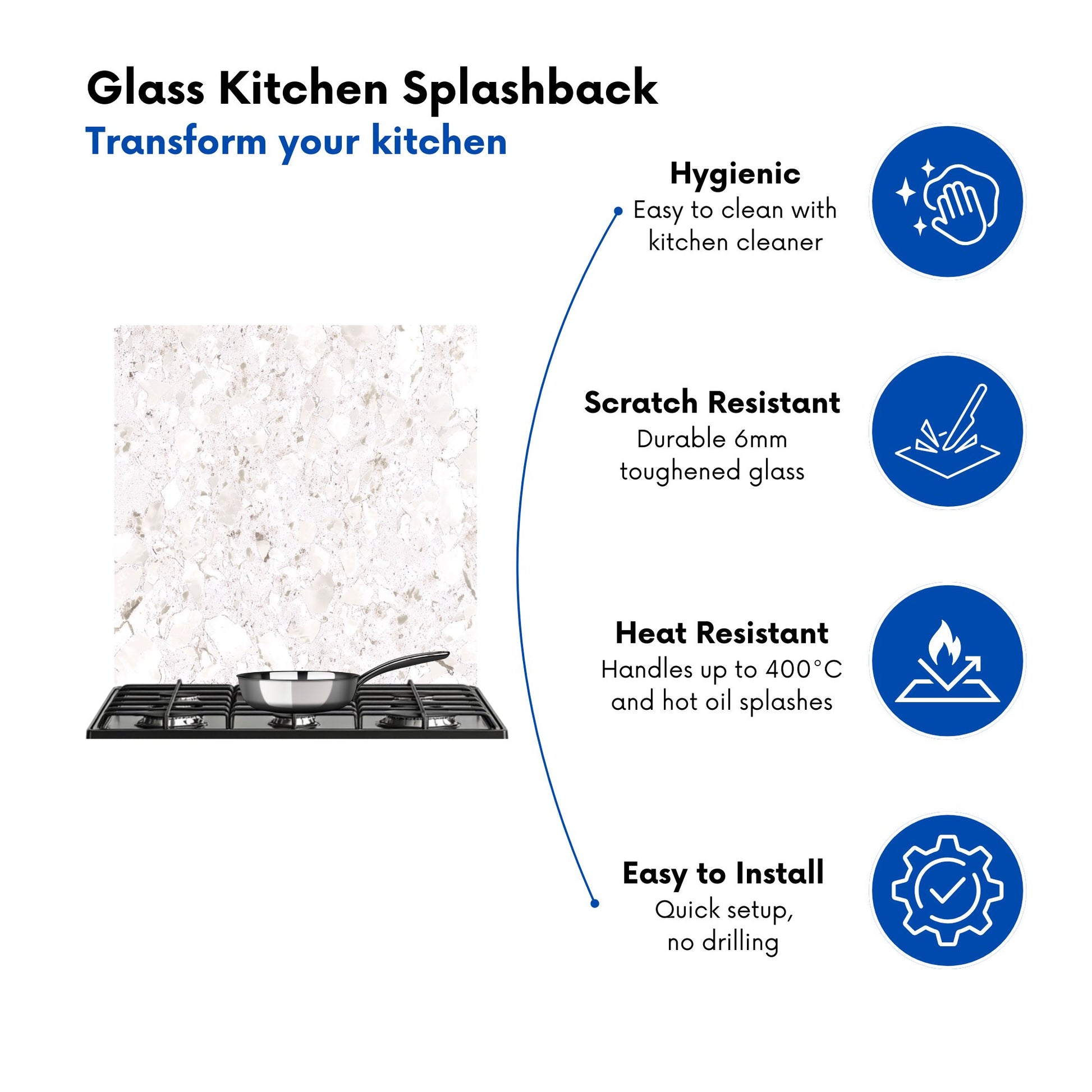 Durable and easy to clean, it's perfect for the kitchen. Whether renovating or updating your home’s look, our Premium 6mm Glass Kitchen Splashback is a stylish choice that makes a lasting impression. Upgrade your kitchen décor today for the perfect mix of beauty and practicality.