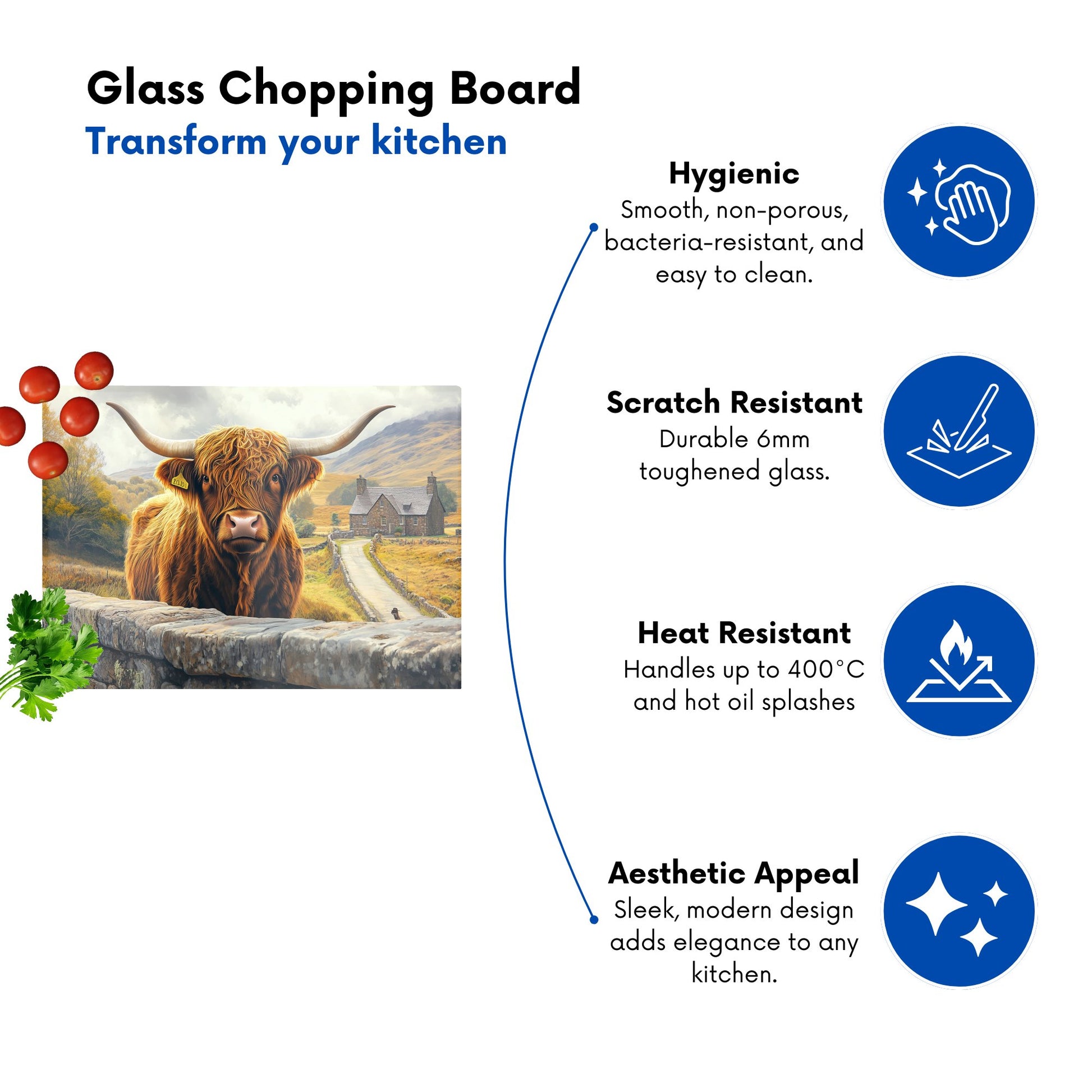 Add a touch of elegance and practicality to your kitchen with this premium glass chopping board from Warren Reed. Made from toughened glass, it’s designed to handle daily use while showcasing stunning artistic designs. Whether you use it as a cutting board, serving platter, or decorative piece, it’s the perfect blend of style and function.